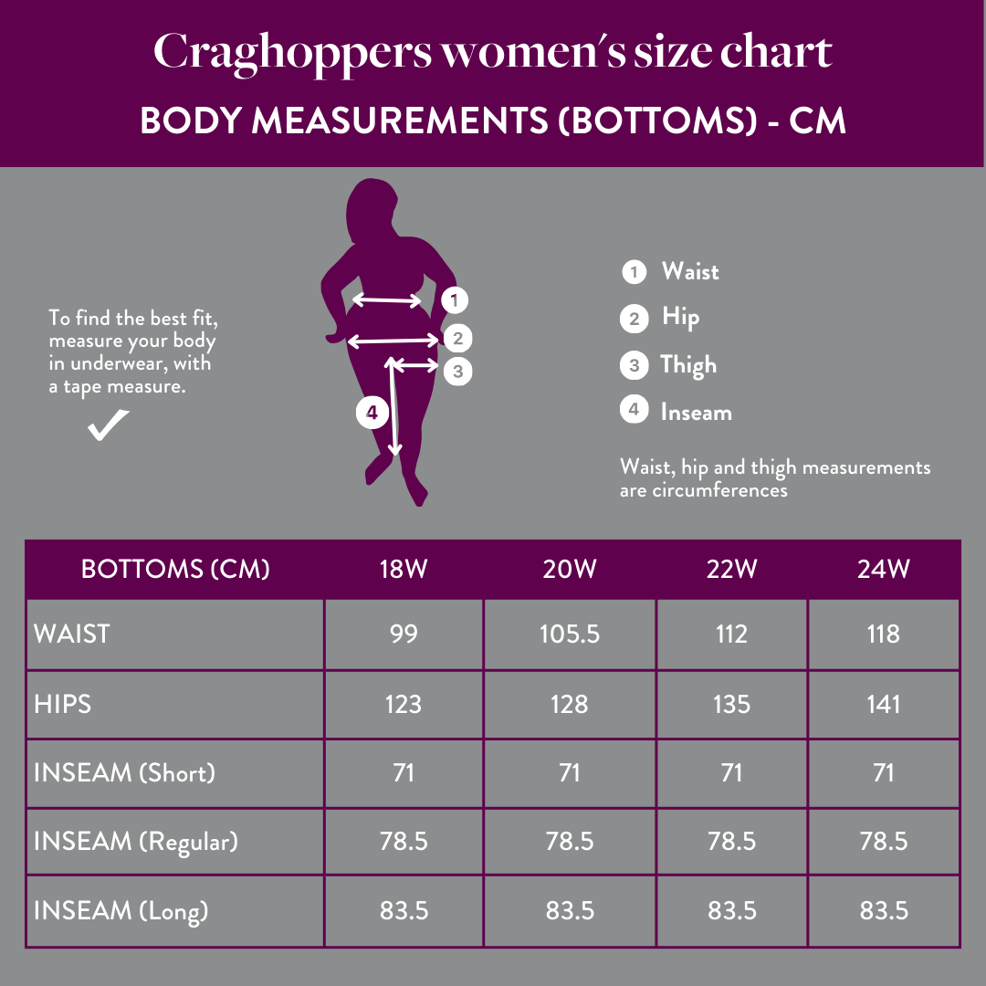 This chart is based on body measurements. Craghoppers uses UK sizes - to find your size please use a tape measure to find your waist and hip size, to find the closest fit.