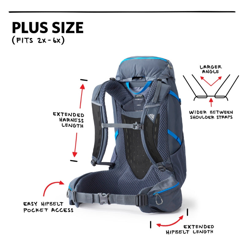 - Available in Plus Size with extended length shoulder straps and hip belts, plus additional fit revisions to accommodate larger body shapes