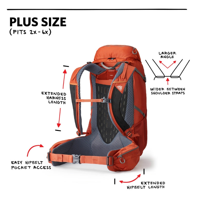 - The torso sizing in Plus Size fit remains consistent with all other Gregory products. See our Fit Chart for complete fit dimensions.