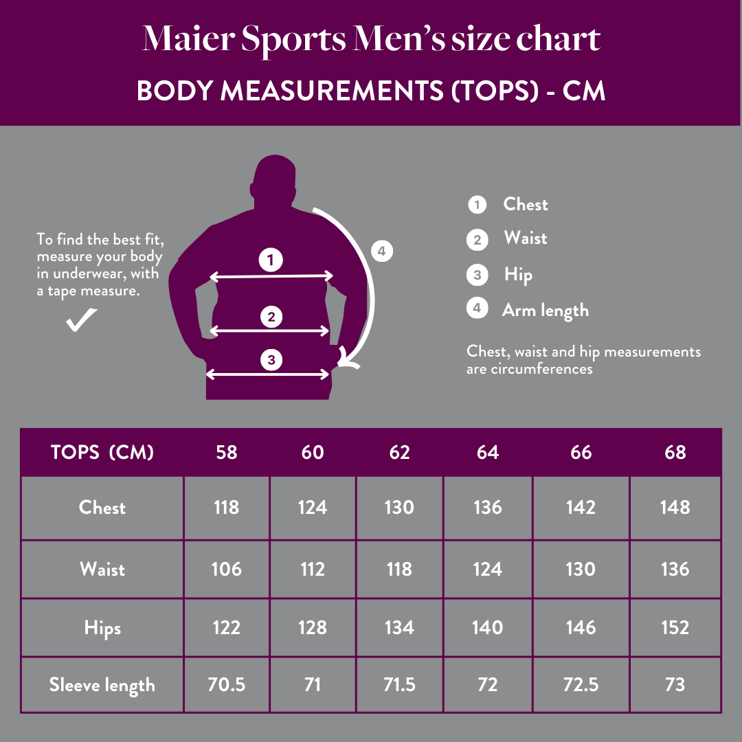This chart is based on body measurements. Maier Sports uses German sizes - to find your size please use a tape measure to find your chest, waist and hip size, to find the closest fit.