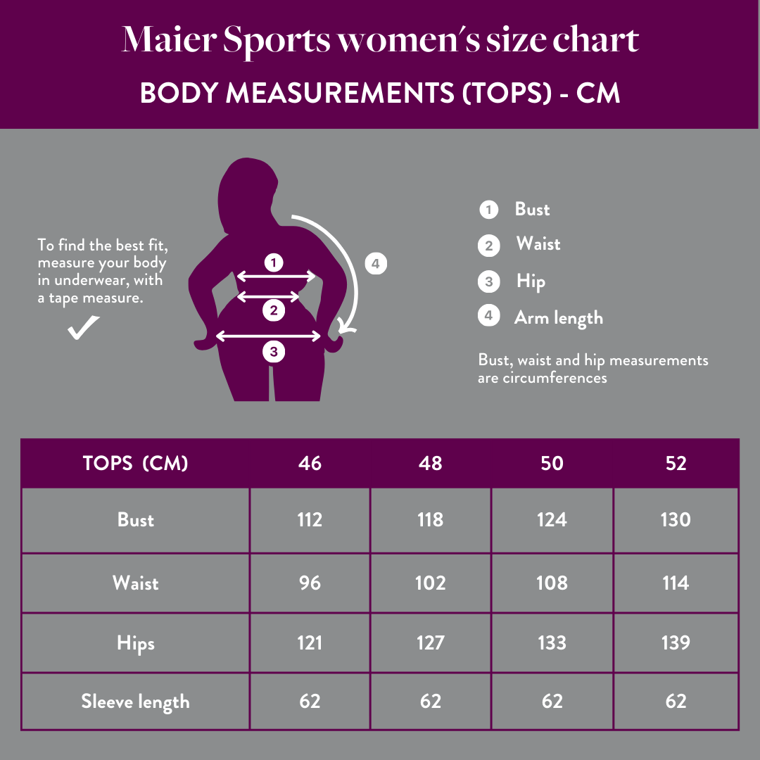 This chart is based on body measurements. Maier Sports uses German sizes - to find your size please use a tape measure to find your bust, waist and hip size, to find the closest fit.