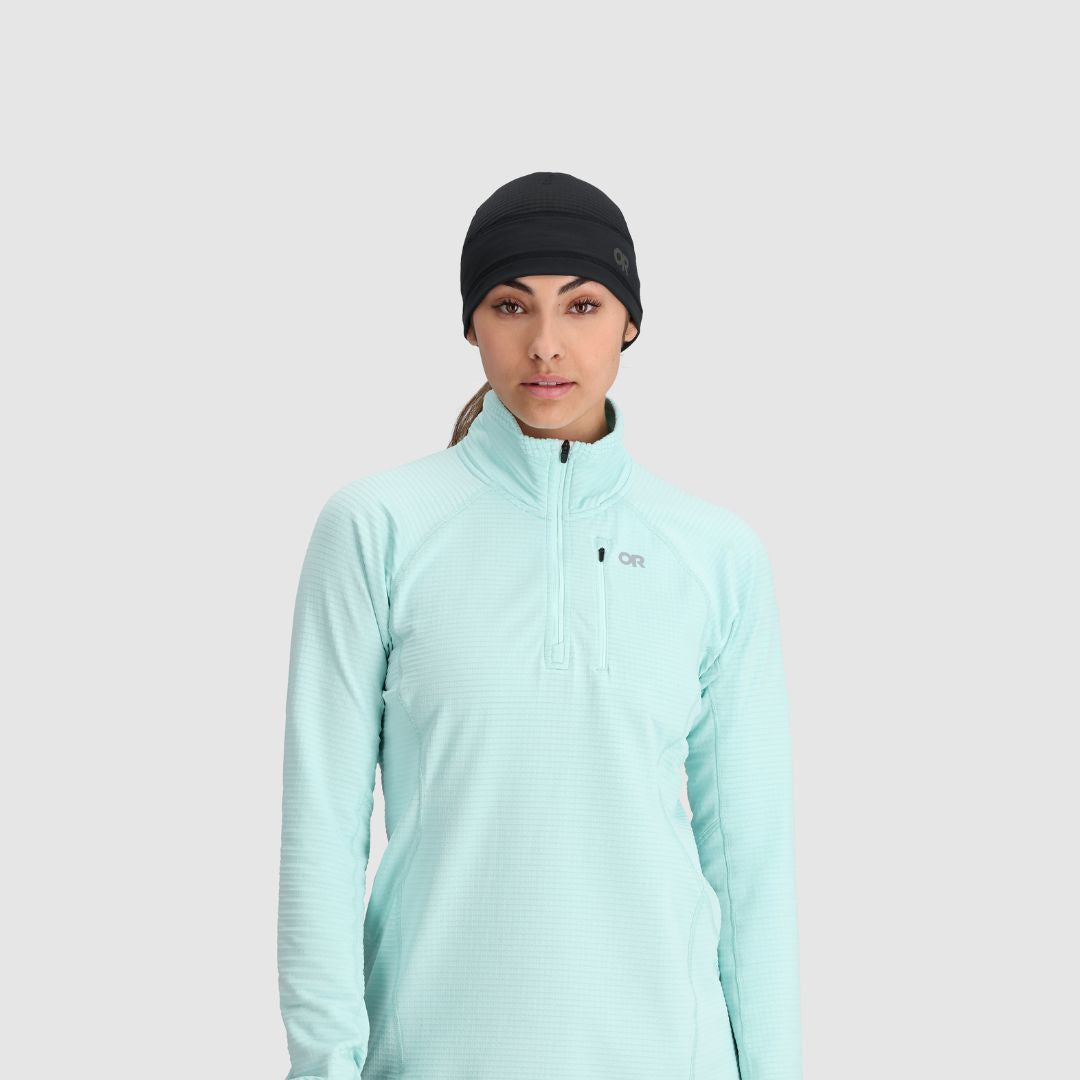 The Vigor Beanie is a performance layer geared toward high-output mountain activity, with a concealed ponytail port.