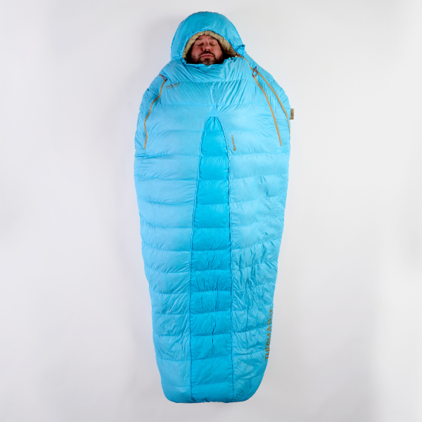 Ultra-comfy warmer weather backpacking sleeping bag with adjustable shape and warmth.