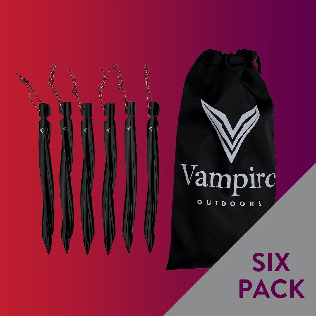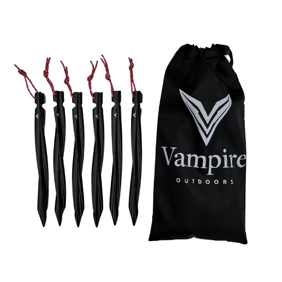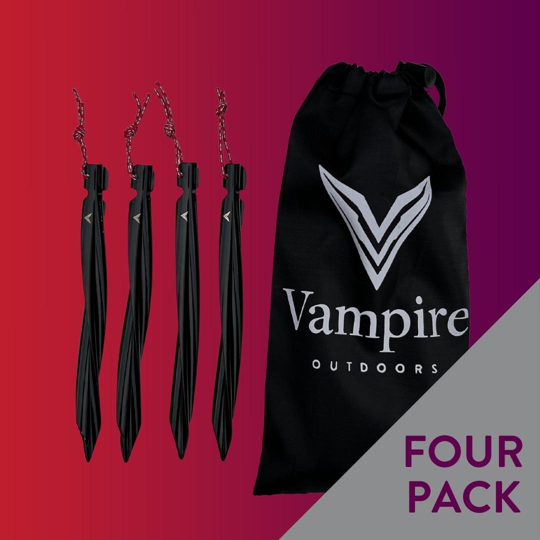 A lightweight but strong, spiral, thick, y-peg tent stake made from 7075 aluminium alloy. Pack contains 4 black tent stakes with red string and a storage bag.